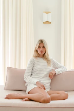 The Baby Sleeper in French Blue, a soft striped shade inspired by Provençal ceramics, features a dual zipper for easy diaper changes. Designed for sleep or play in silky soft, naturally hypoallergenic 100% Pima cotton, this fuss-free, footed style includes sole grips in sizes 12-18m & 18-24m.