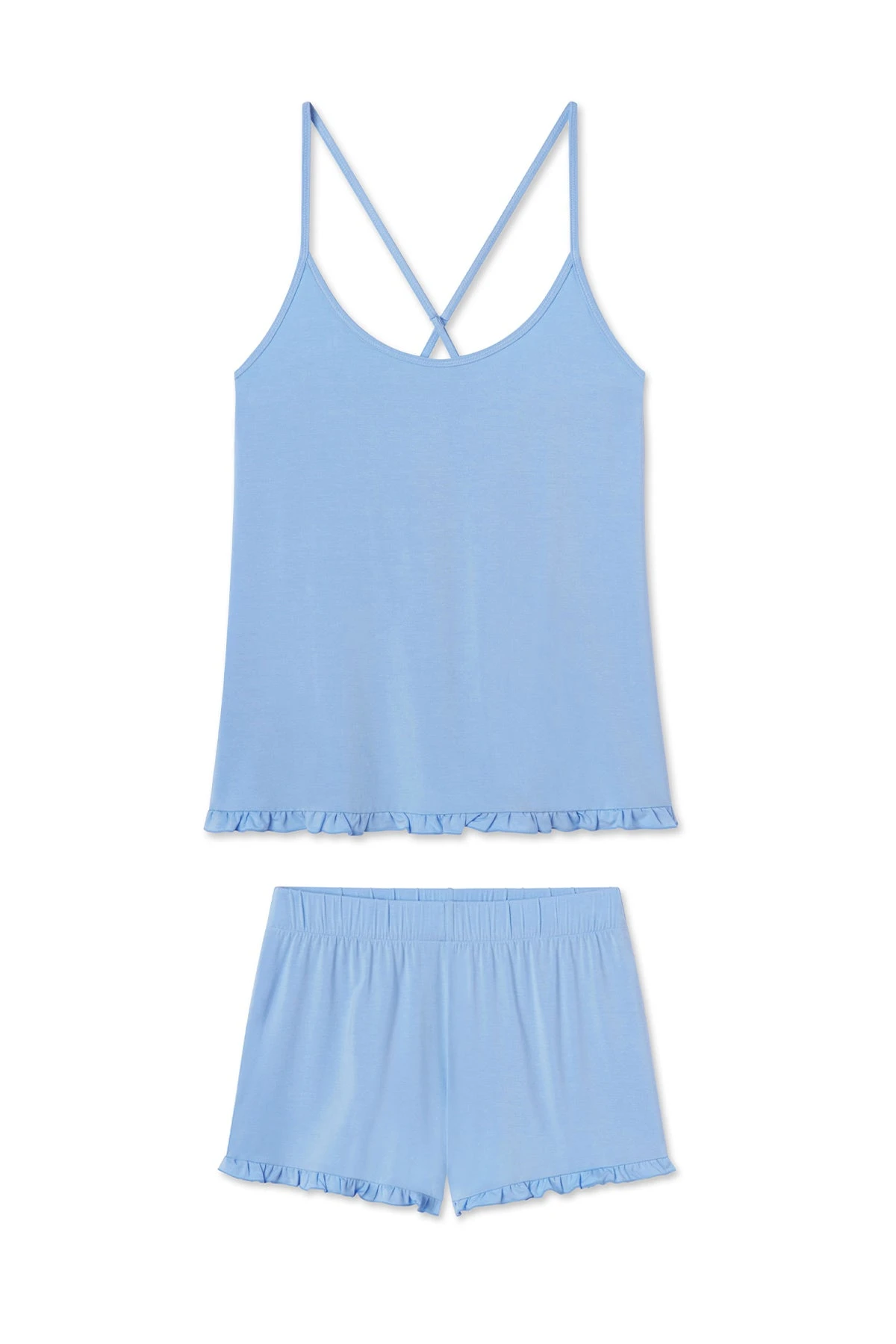 The DreamKnit Charlotte Shorts Set in French Blue, a soft shade inspired by Provençal ceramics, features a crossed, adjustable spaghetti-strap top with a ruffled hemline. The shorts, also with a ruffled hemline, have an elastic waistband. Made of 95% modal, 5% spandex.