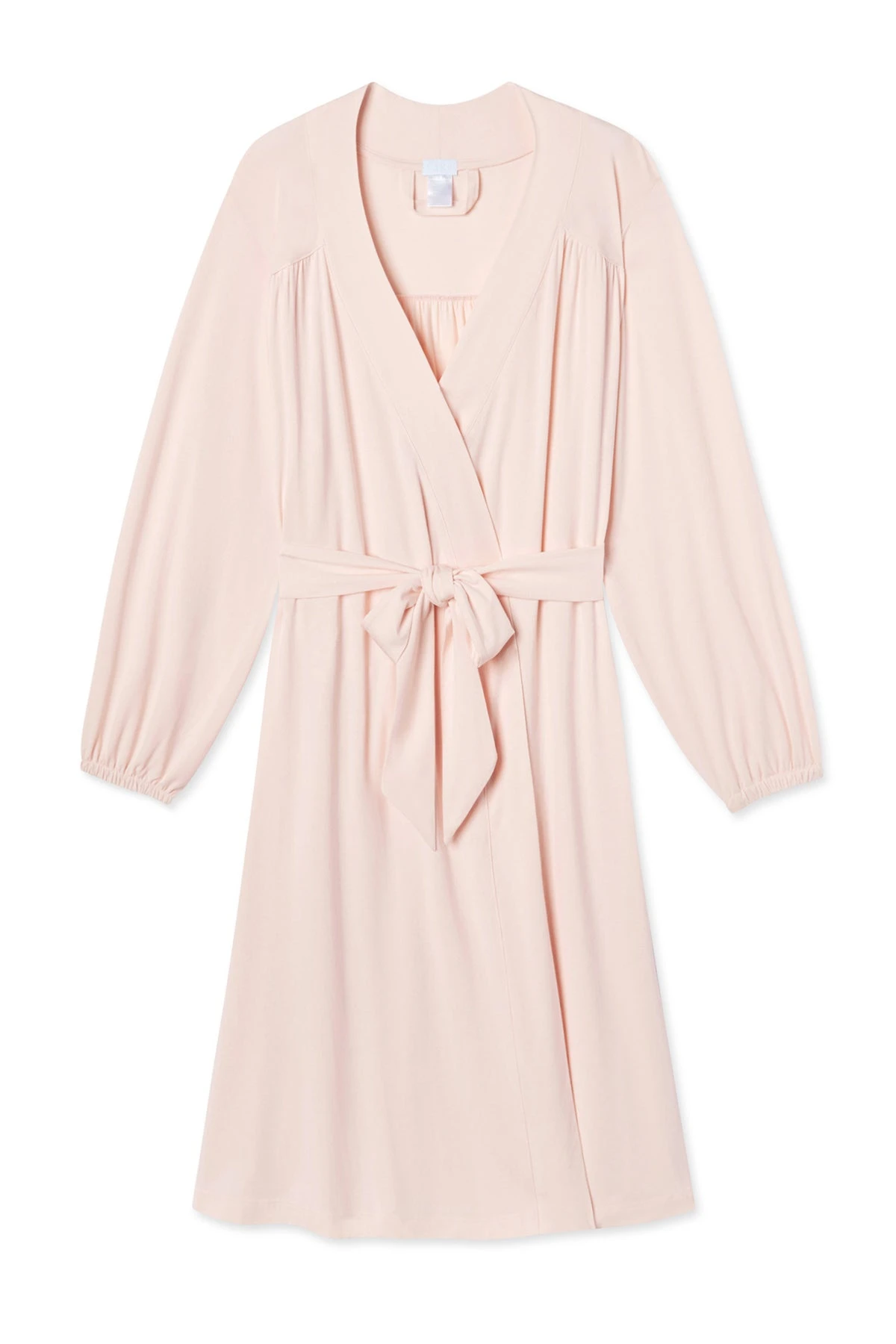 in Peony, a blushing whisper of pink, features a front and back yoke and stitched-in belt, and elasticated bracelet sleeves, gracefully marrying form and function. Made of 95% modal, 5% spandex.