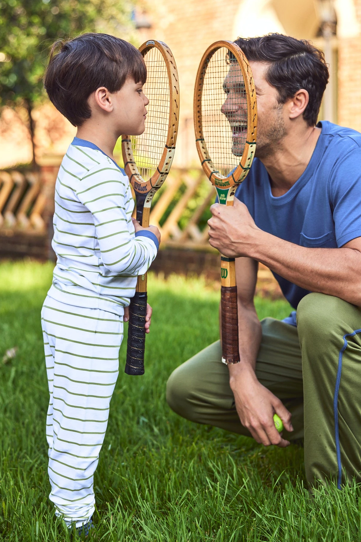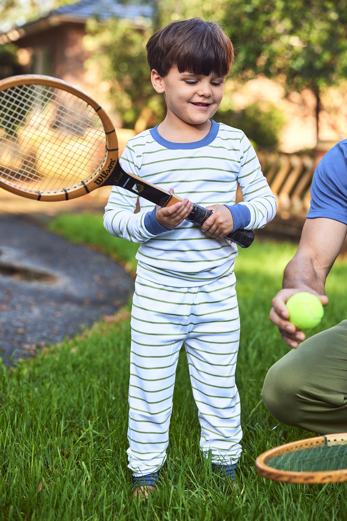 The Kids Long-Long Set in Olive Stripe, a thin, green stripe with contrasting blue binding, features a long-sleeve top and pants with an elastic waistband. Made from 100% Pima cotton. This garment is not flame resistant. For the child’s safety, this garment should fit snugly.