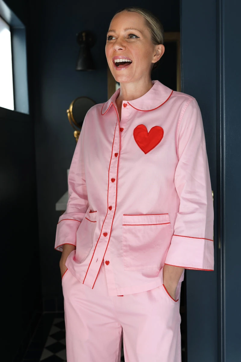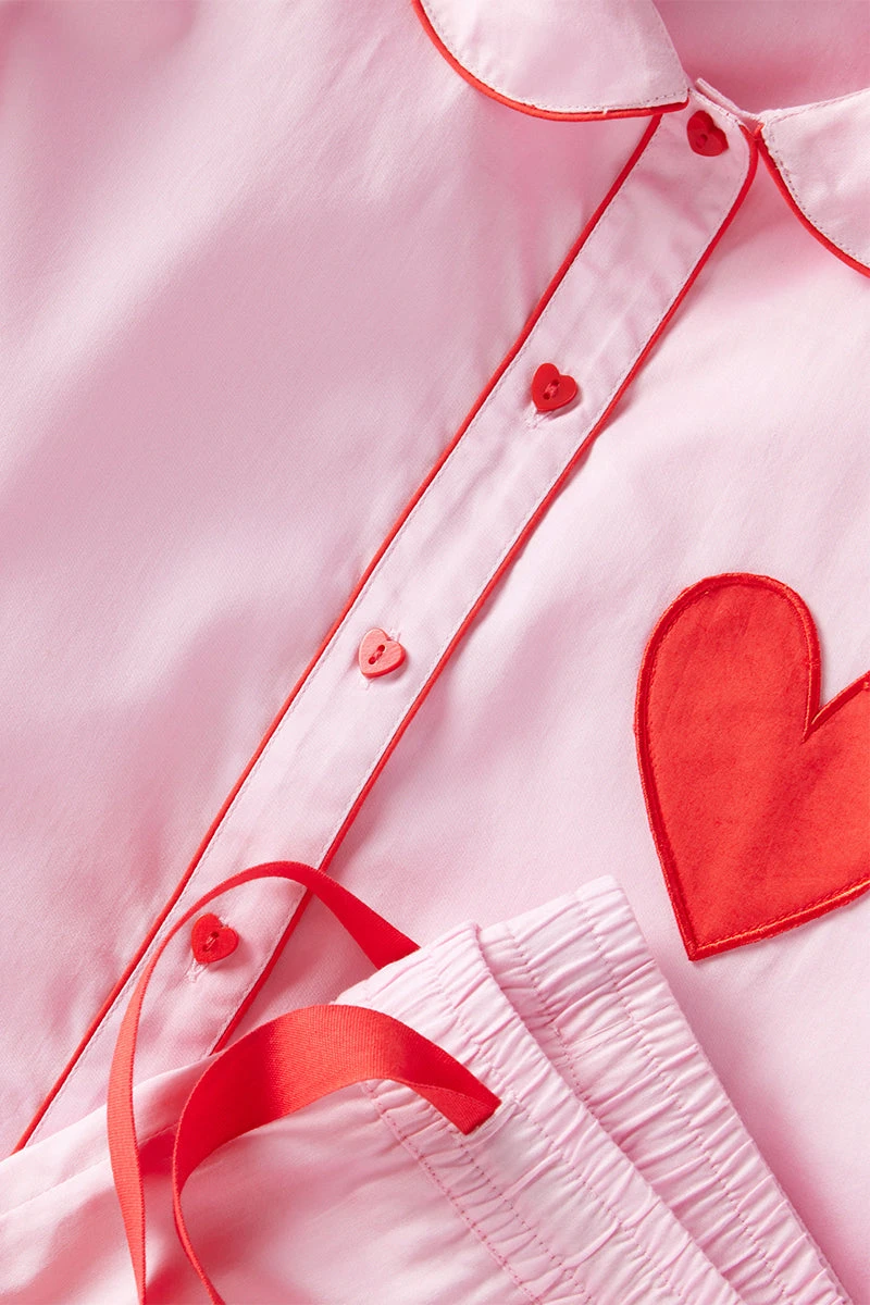 The Poplin Margot Set in Primrose, a soft pink with red piping, features a button-down, bracelet-length top with a widened Peter Pan collar with contrast fabric at the collar and cuff, heart-shaped buttons, and a red heart pocket. The cropped pants feature an elastic waist with a functional red twill tie and contrast cuffs. Made from 100% cotton poplin.