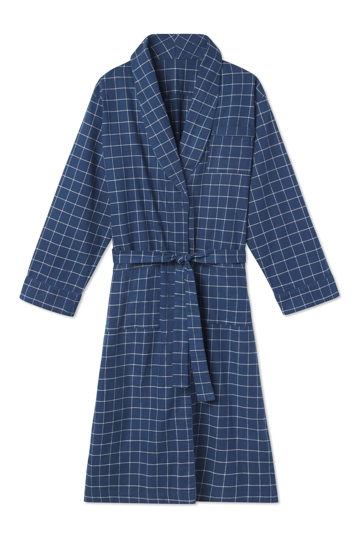 The Men’s Flannel Robe in Navy Windowpane, a patterned blue and white, features long sleeves, a sewn-in belt, and side pockets. Made of 100% mid-weight cotton flannel.
