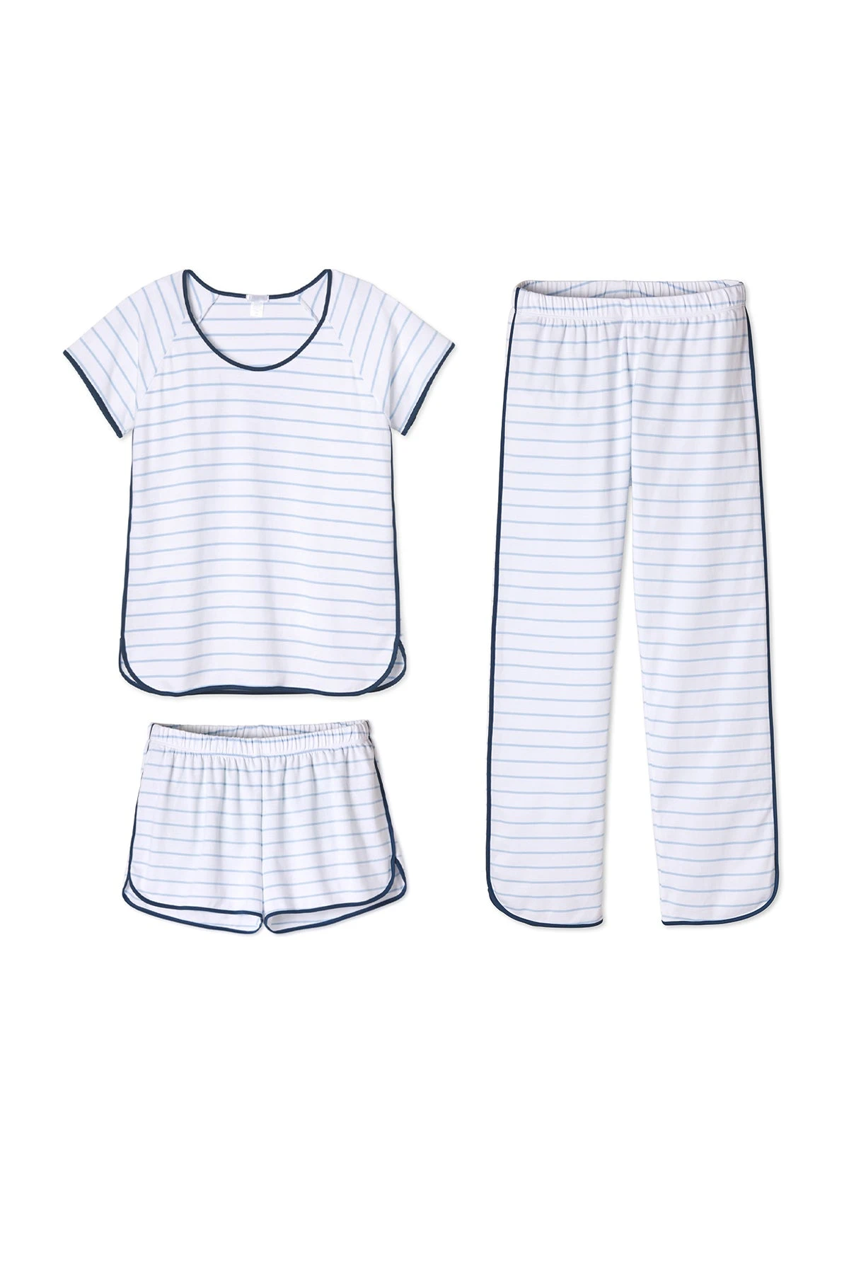 The Bundle in Marine, a light blue and white Breton stripe with navy trim, includes a short sleeve top, shorts, and pants with an elastic waistband. Made from 100% Pima cotton.