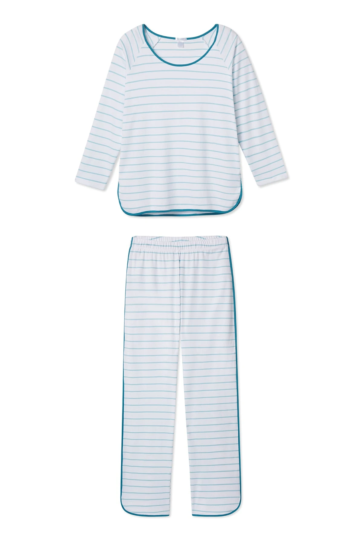 The Pima Long-Long Set in Agate, the prettiest teal featuring tonal binding, features a three-quarter sleeve scoop neck top and pants with an elastic waistband. Made from 100% Pima Cotton.