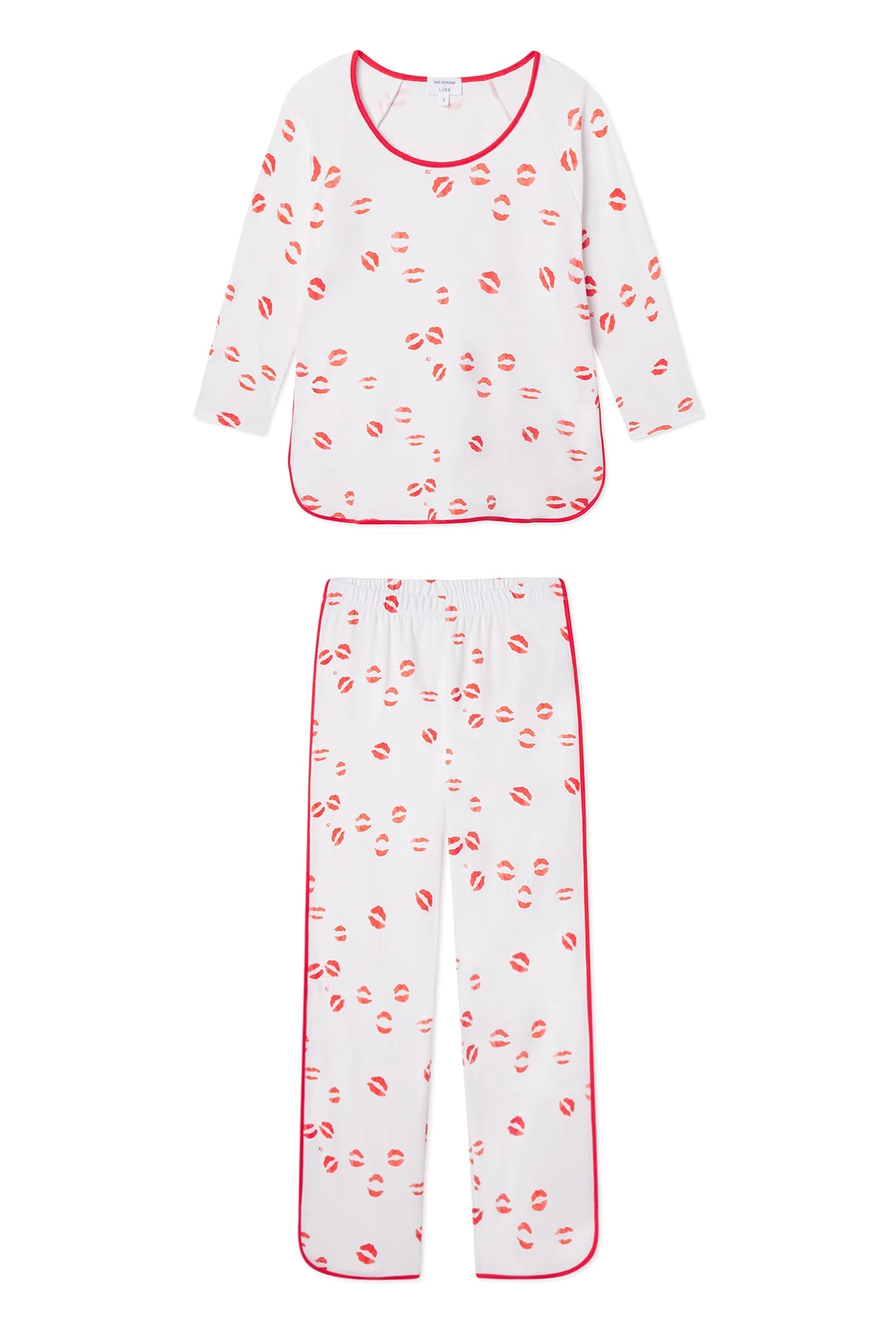 The Pima Long-Long Set in Kisses, featuring painterly pecks from artist Kate Schelter, features a three-quarter sleeve scoop neck top and pants with an elastic waistband. Made from 100% Pima cotton.