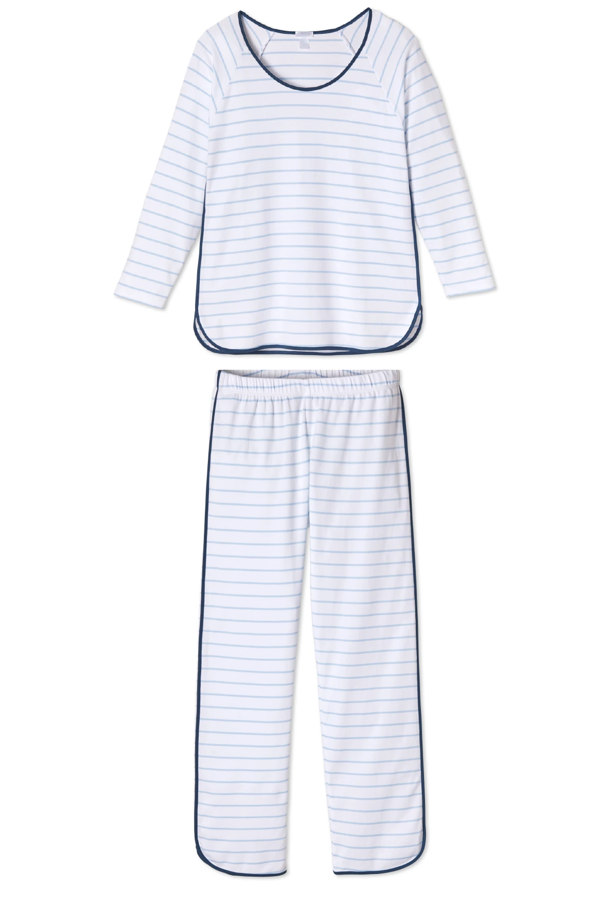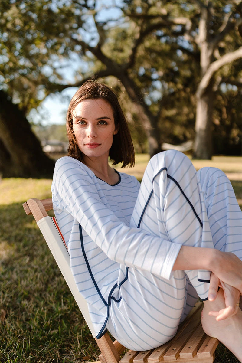 The Pima Long-Long Set in Marine, a light blue and white Breton stripe with navy trim, features a three-quarter sleeve scoop neck top and pants with an elastic waistband. Made from 100% Pima cotton.