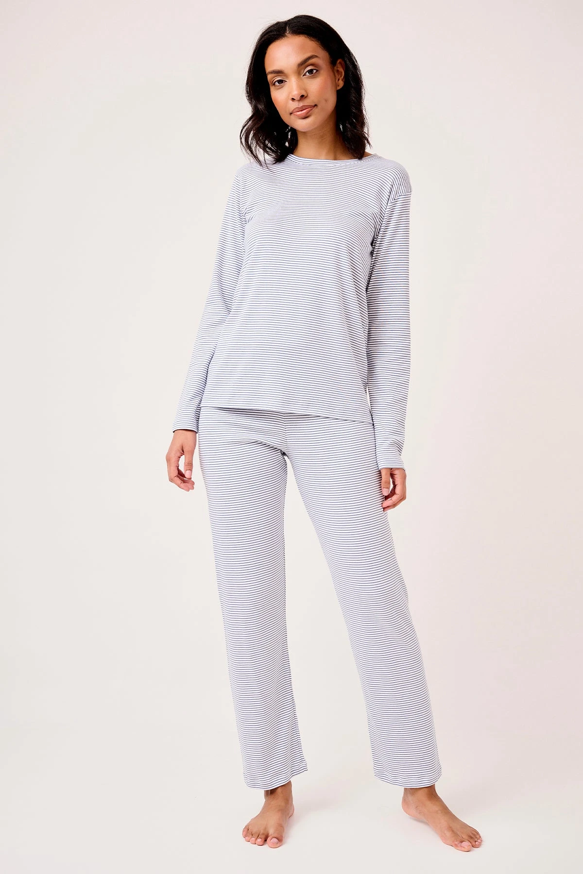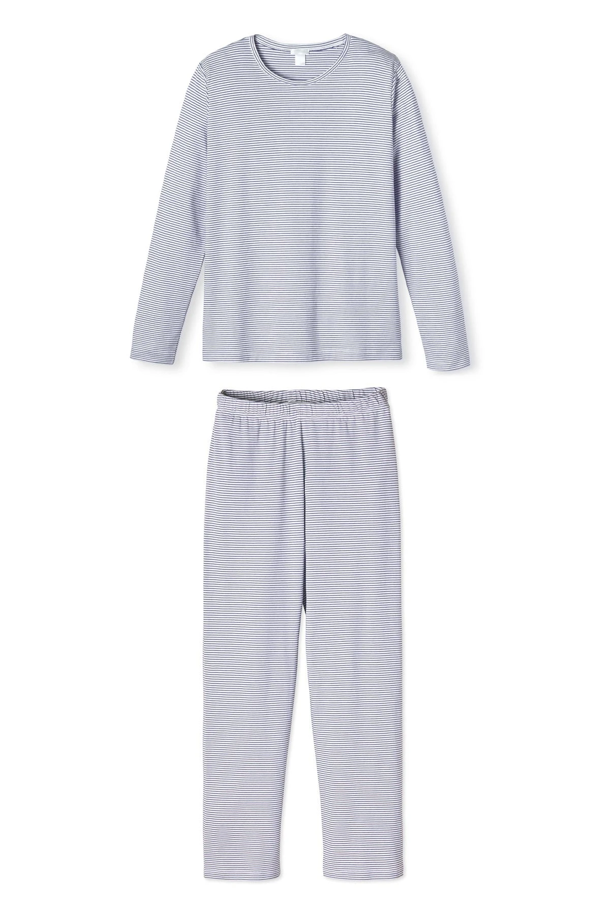 The Long-Long Weekend Set in Classic Navy, a traditional blue and white stripe, features a fitted, long-sleeve crewneck top. The pants are high-waisted with an elastic waist and straight-edge hem. Made from 100% Pima Cotton.