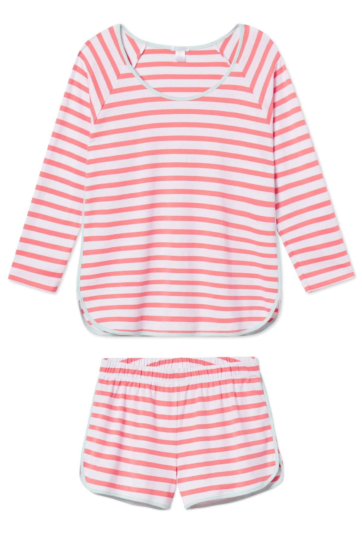 The Pima Long-Short Set in Pareo, a thick coral and white stripe with mint trim, features a 3/4-length sleeve scoop neck top and shorts with an elastic waistband. Made from 100% Pima cotton.