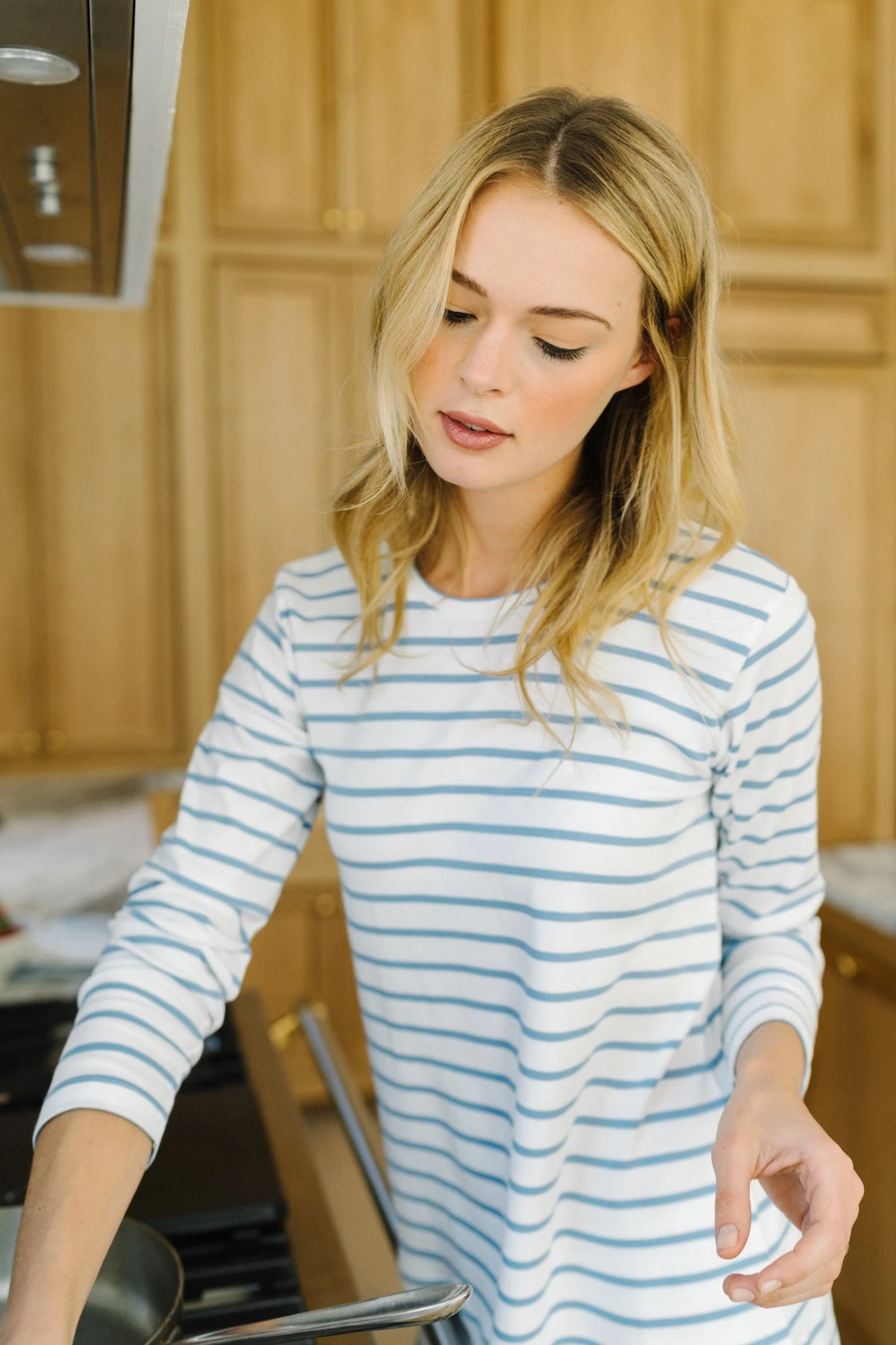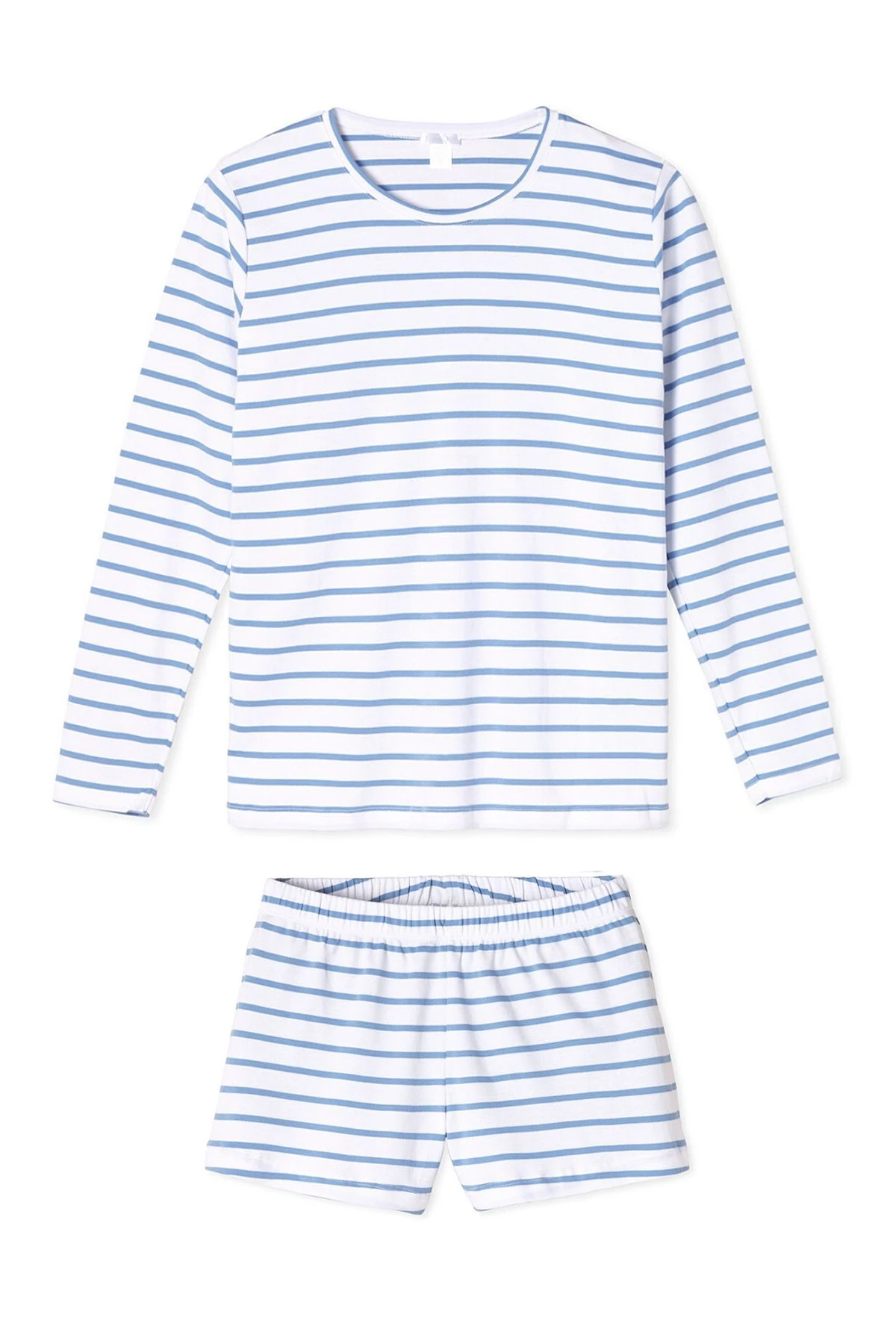 The Pima Long-Short Weekend Set in Bistro, a soft, mid-toned blue stripe set on white, features a long-sleeve crewneck top and shorts with an elastic waistband and 3″ inseam. Made from 100% Pima Cotton.