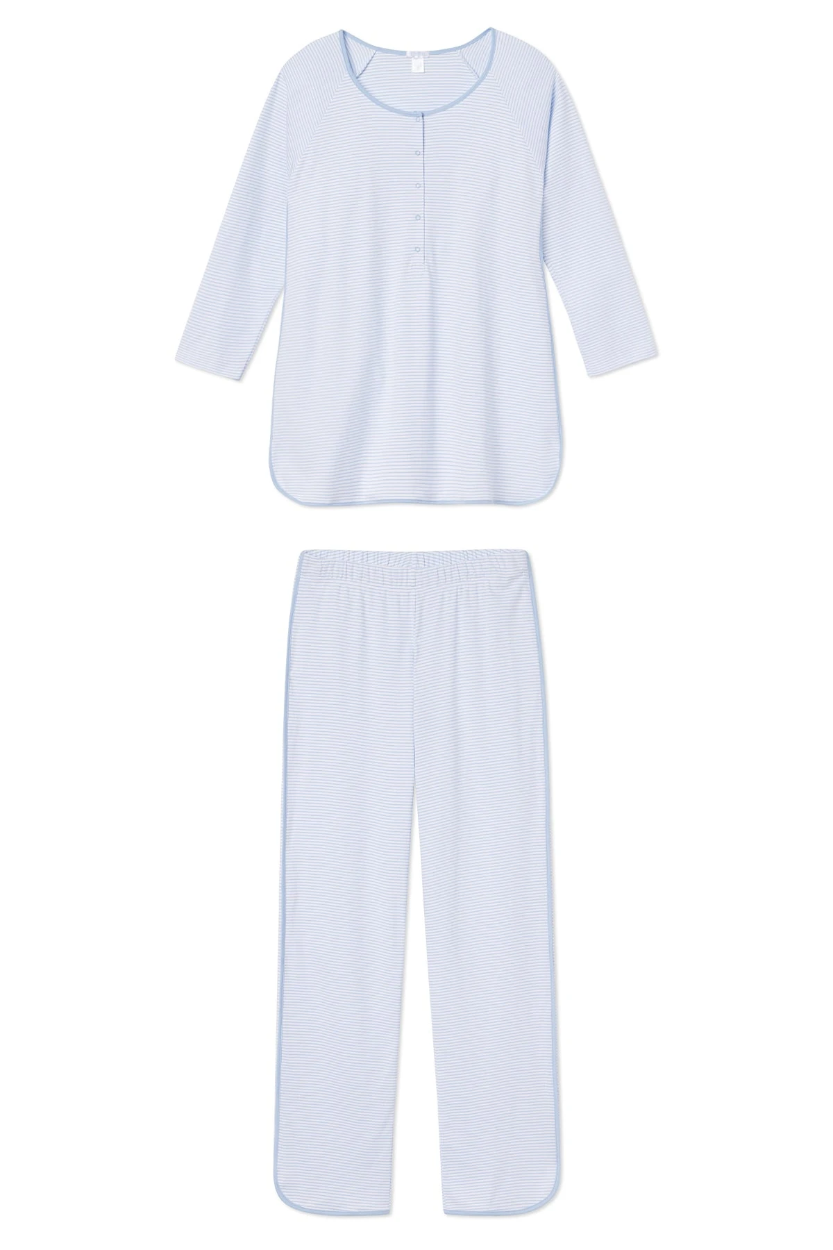 The Maternity Long-Long Set in French Blue, a soft, striped shade inspired by Provençal ceramics, features a three-quarter sleeve scoop neck top with nursing-friendly snaps and room for a bump. The pants have an elastic waistband. Made from 100% Pima cotton.