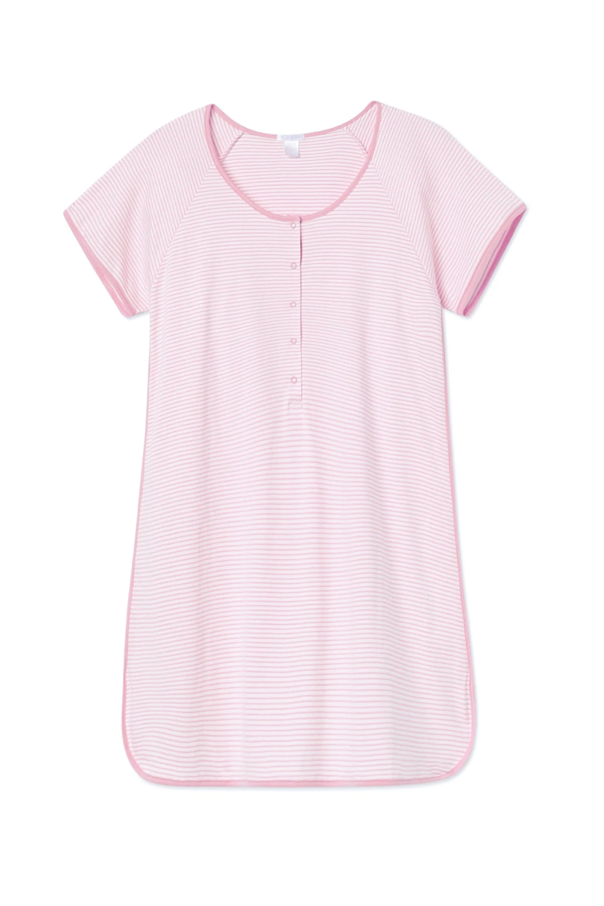 The Maternity Nightgown in Lily, a pale pink and white stripe, features a short-sleeve scoop neck with nursing-friendly snaps and room for a bump. It’s ideal for pregnancy and post-delivery. Made from 100% Pima cotton.