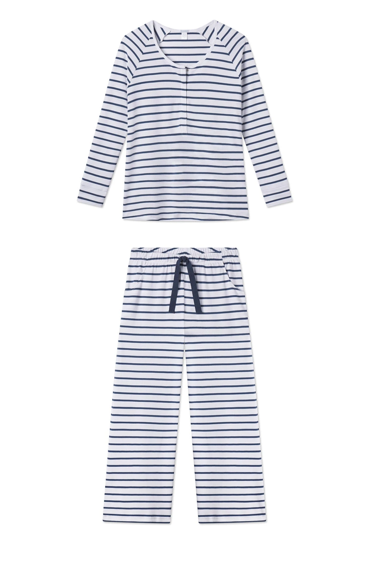 The Pima Maternity Wide Leg Pajama Set in White Breton Stripe, a classic navy stripe set on white, pairs a long-sleeve top with wide-leg, cropped pants. The top features raglan sleeves and cuffs, a hidden snap placket for nursing or pumping, and a roomier fit for a growing bump. The pants feature a functional twill tie plus pockets — perfect for a phone… or a pacifier. Made from 100% Pima cotton.