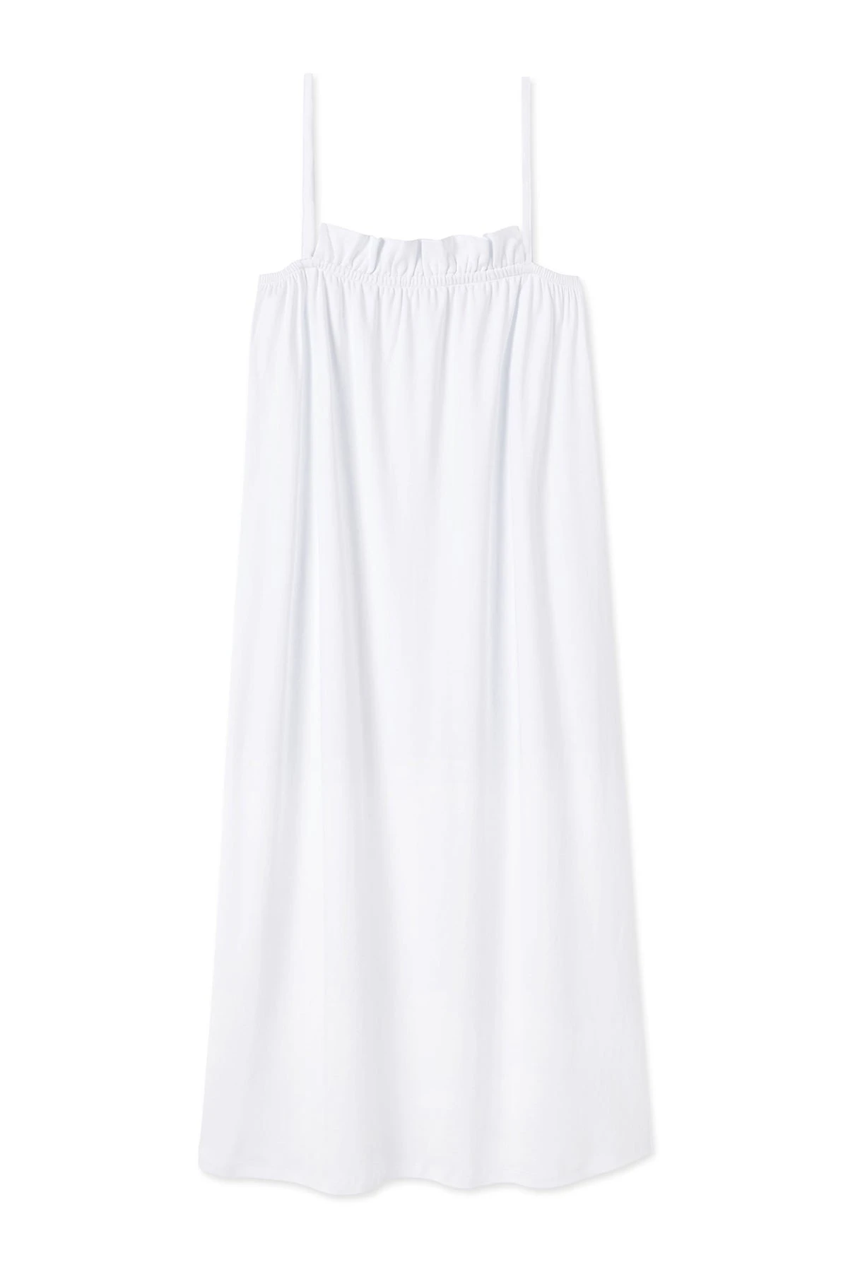 The Ruffle Midi Nightgown in simple, solid White, is designed with simple, adjustable spaghetti straps. This is our sweetest sleepwear yet, thanks to its ruffle detail, true midi length, and fully elasticated top. Made from 100% Pima cotton.