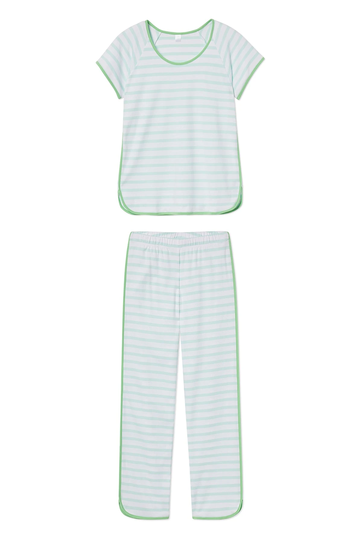 Our women’s Short-Long style in Harbor, a mint and white stripe with a soft green contrast binding, features a short-sleeve scoop neck top and pants with an elastic waistband. Made from 100% Pima cotton.