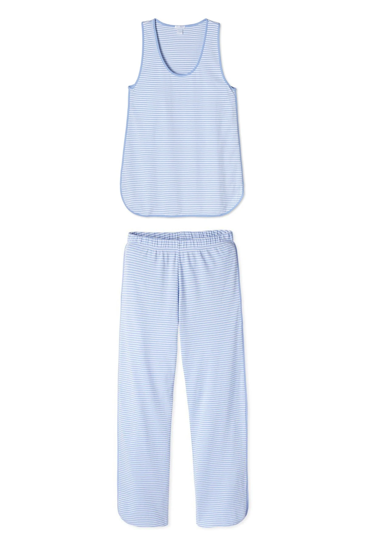 The Pima Tank-Long Set in Hydrangea, our best-selling purpley-blue, features a sleeveless scoop neck top and pants with an elastic waistband. Made from 100% Pima cotton.