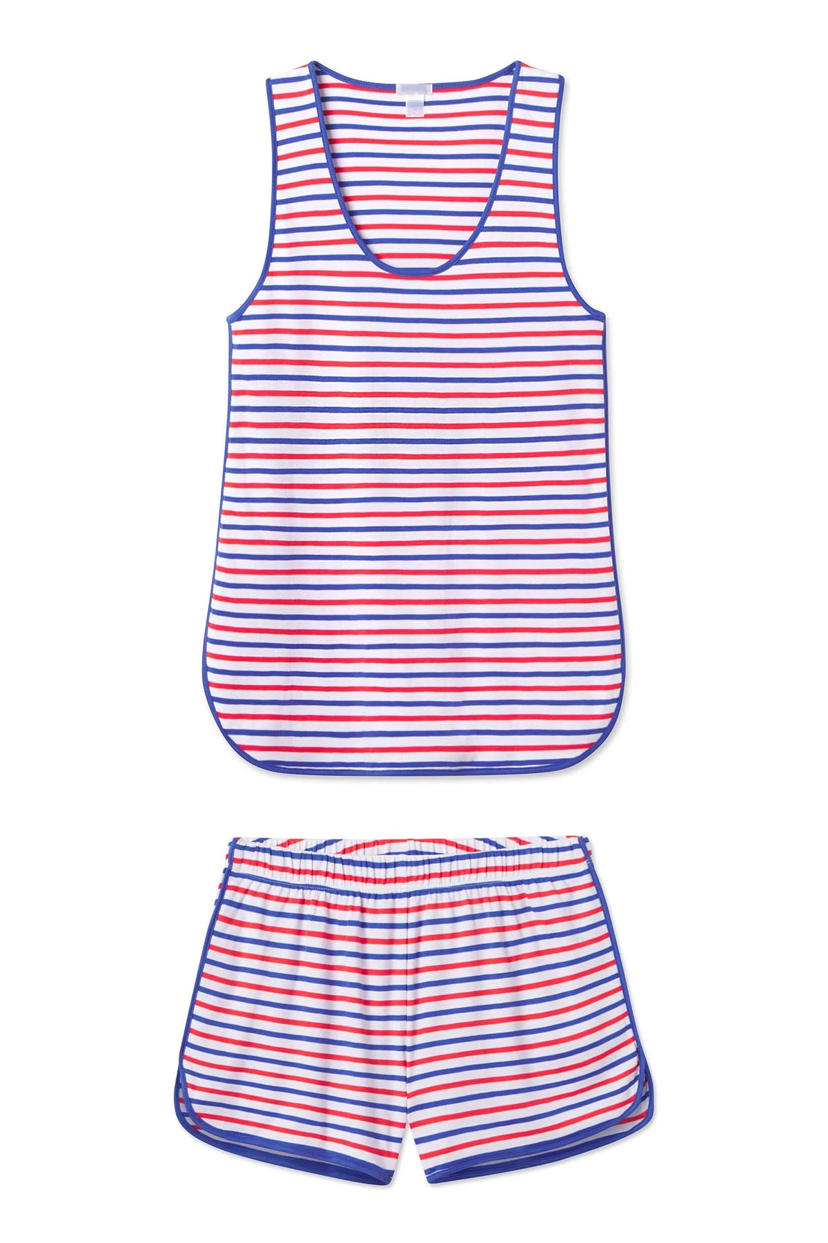 The Pima Tank-Short Set in Liberty Stripe, our ode to Americana style in red, white, and blue with a mid-tone blue binding, features a sleeveless scoop neck top and shorts with an elastic waistband. Made from 100% Pima cotton.