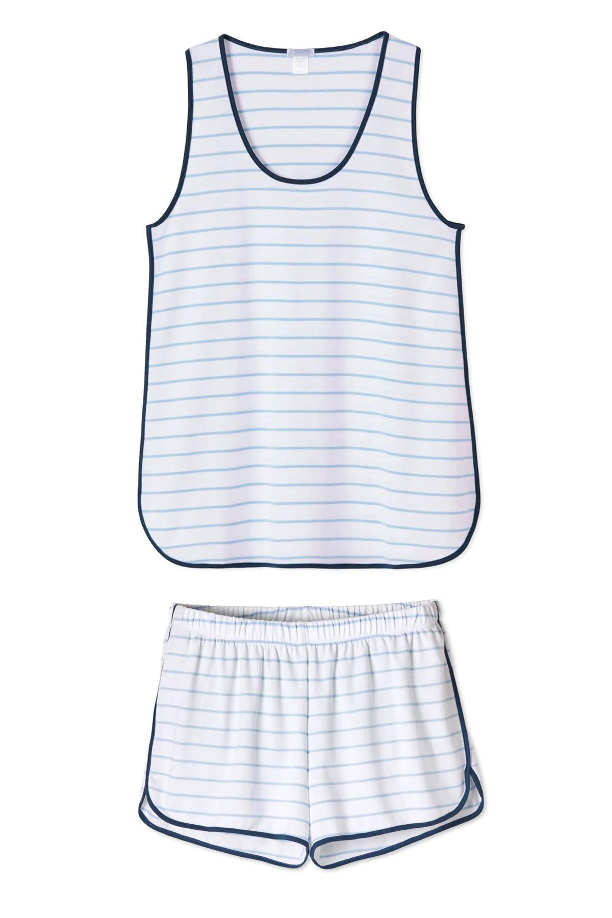 The Pima Tank-Short Set in Marine, a light blue and white Breton stripe with navy trim, features a sleeveless scoop neck top and shorts with an elastic waistband. Made from 100% Pima cotton.