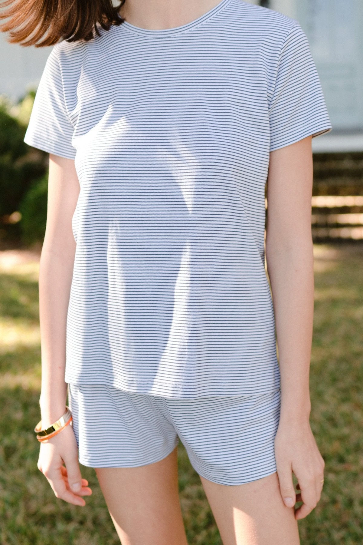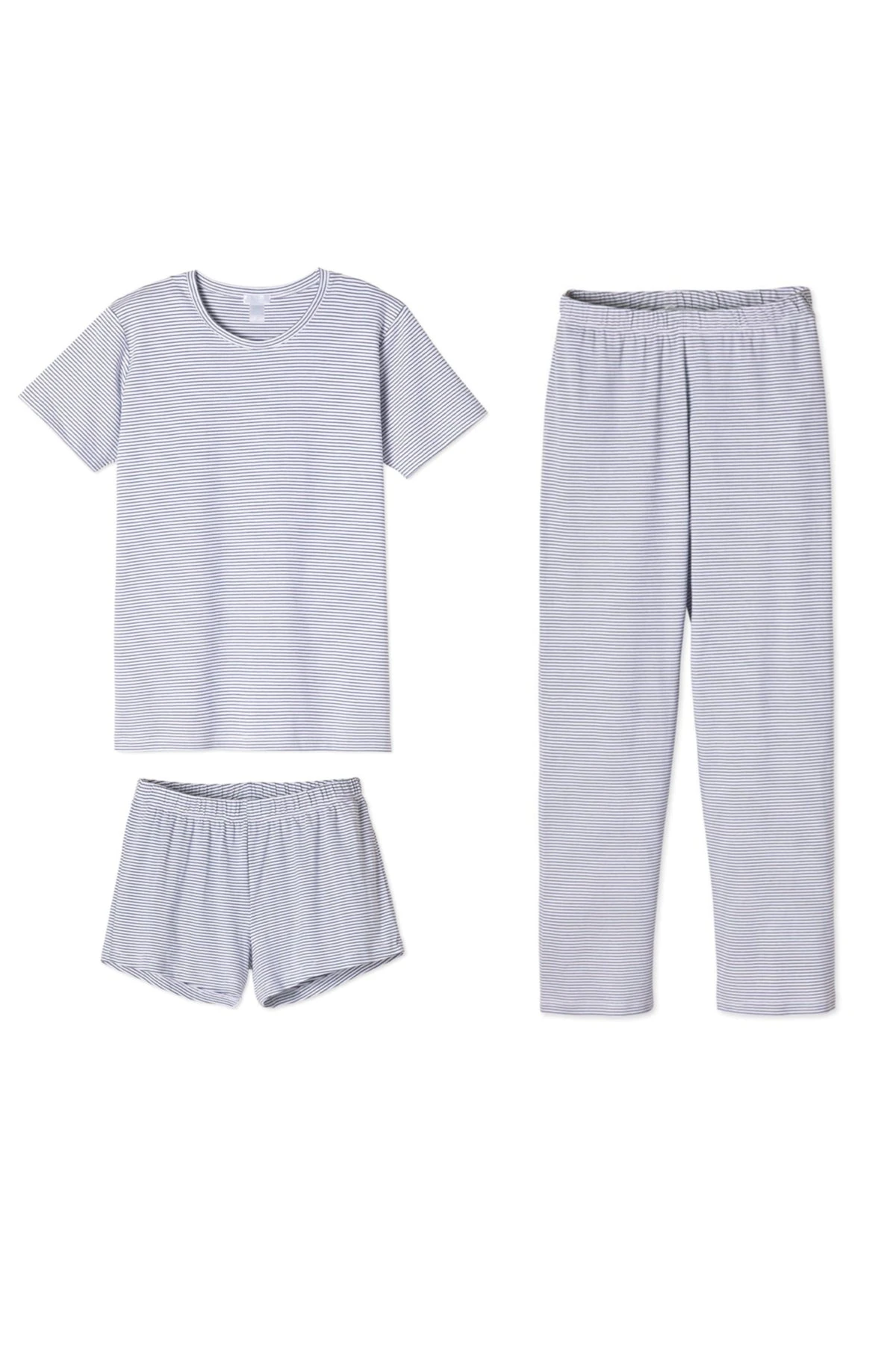 The Weekend Bundle in Classic Navy, a traditional blue and white stripe, features a fitted, sleeveless crewneck top. The pants and shorts are high-waisted with an elastic waist and straight-edge hem. Made from 100% Pima cotton.