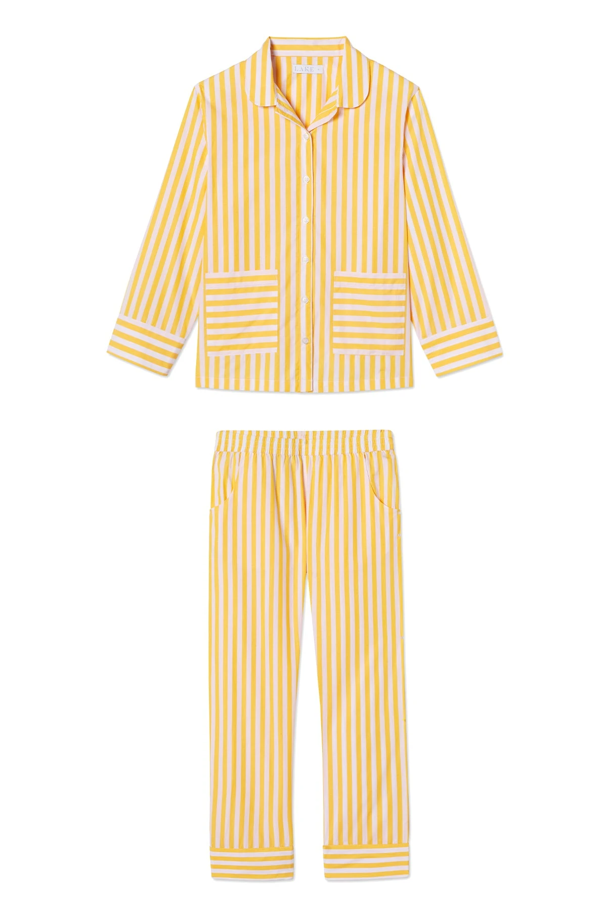 The Pocket Pants Set in Rally, a sunshine yellow stripe, features a collared long-sleeve button-up top and pants with pockets and an elastic waist. Made of 100% cotton poplin.