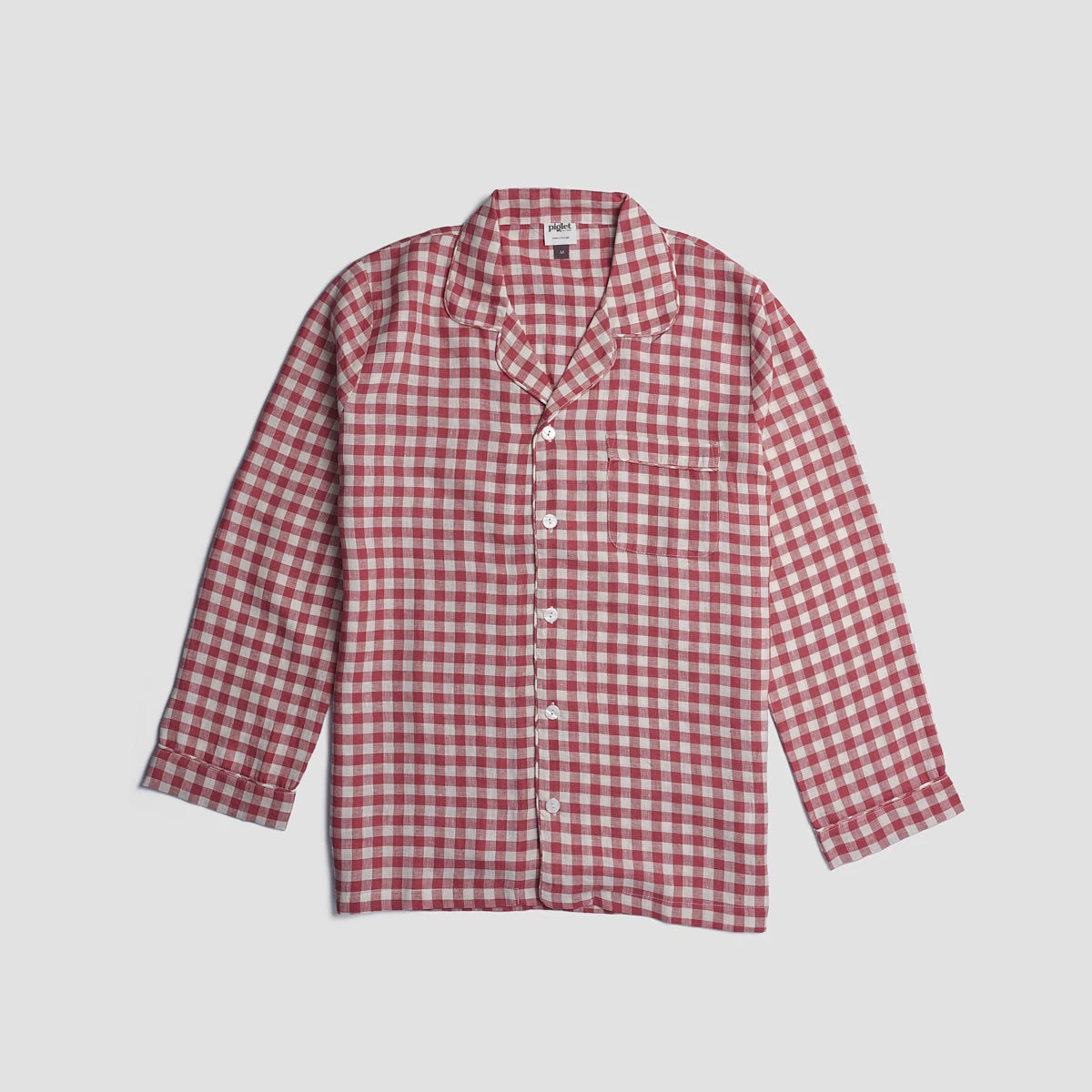 Evoke a feeling of nostalgic charm with our Mineral Red Gingham Linen Pajama Pant Set, made from super soft 100% stonewashed linen. Made for slow weekend mornings and cozy nights in, our gingham linen sleepwear collection is completely natural and thermo-regulating, keeping you snug during winter and cool throughout the summer. The shirt and trouser shape is classic, and being made from lightweight natural linen makes this linen pajama set effortlessly comfortable.